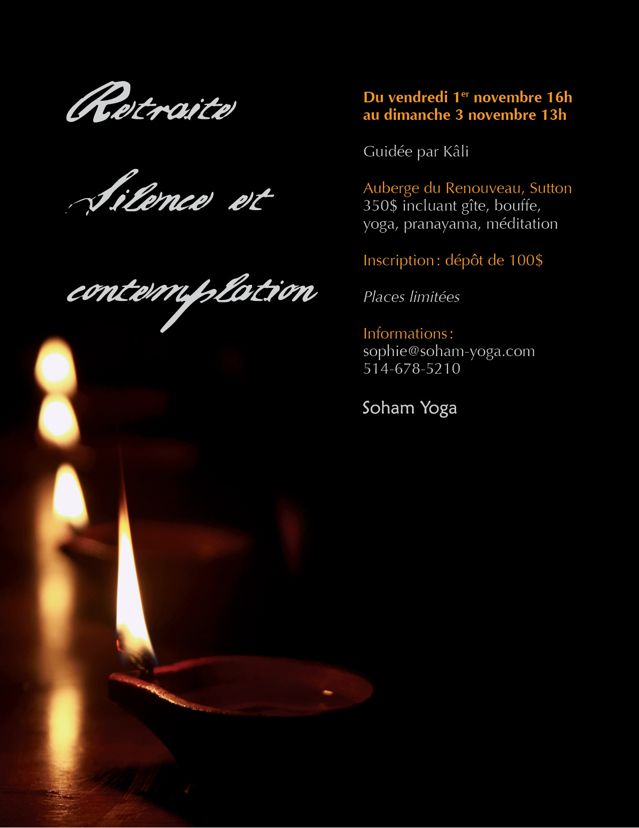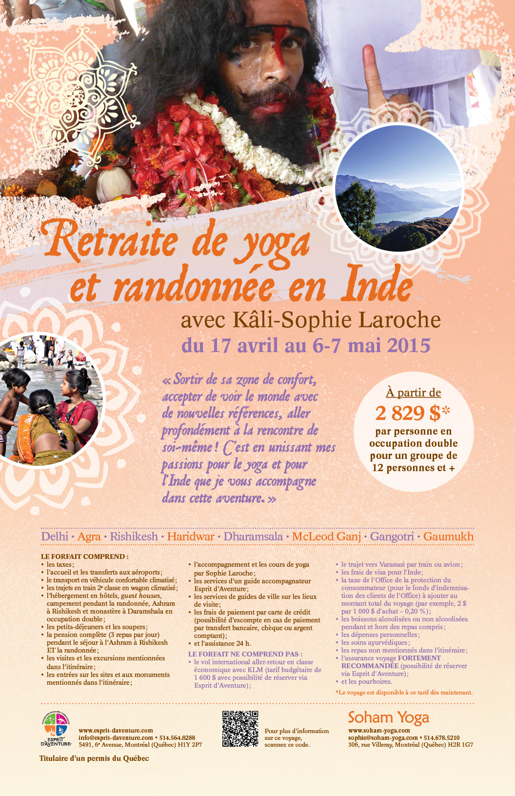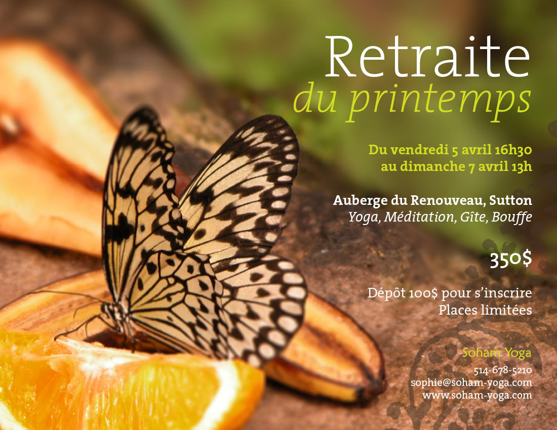 Différentes affiches promotionnelles pour le studio Soham Yoga annonçant les retraites. / Promotional posters for Soham Yoga retreats.