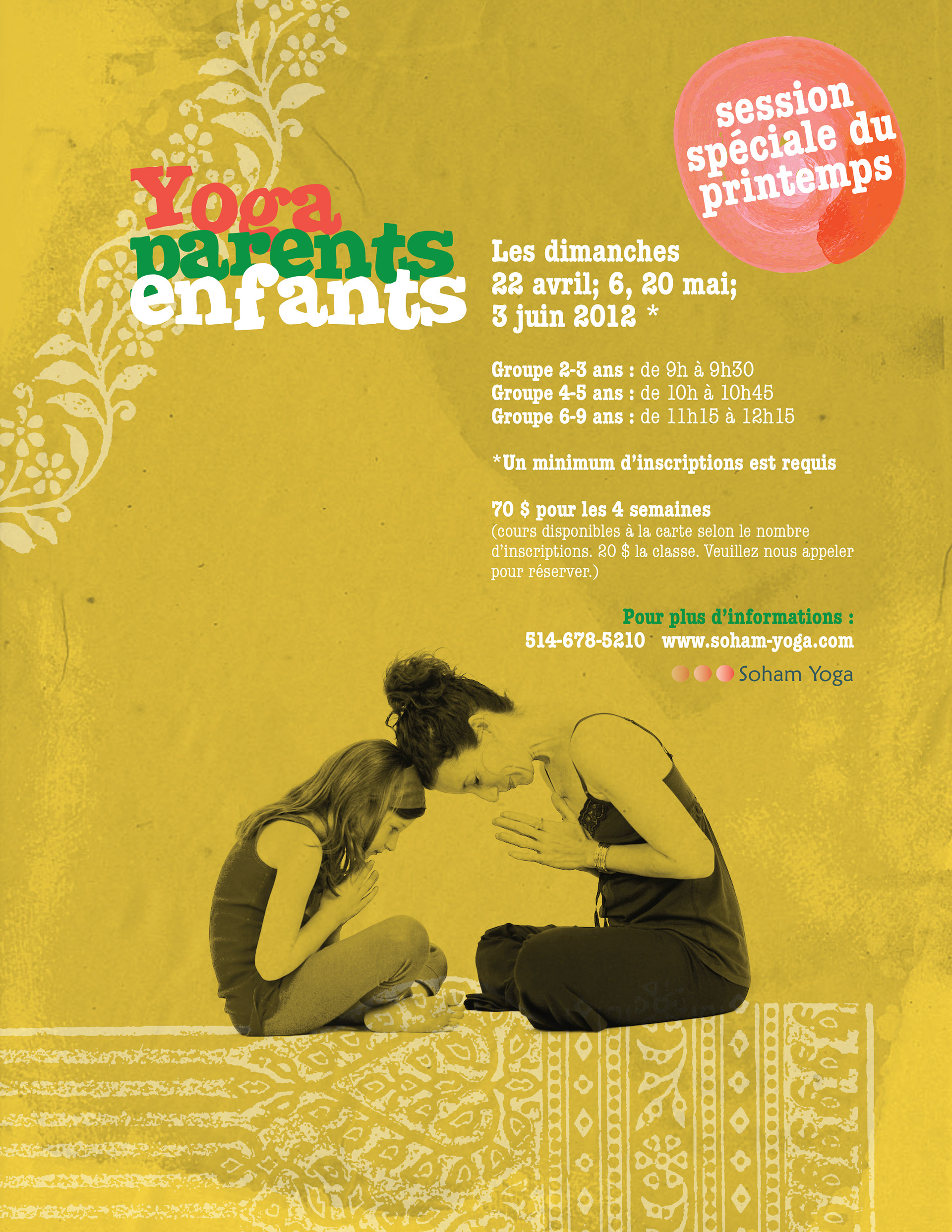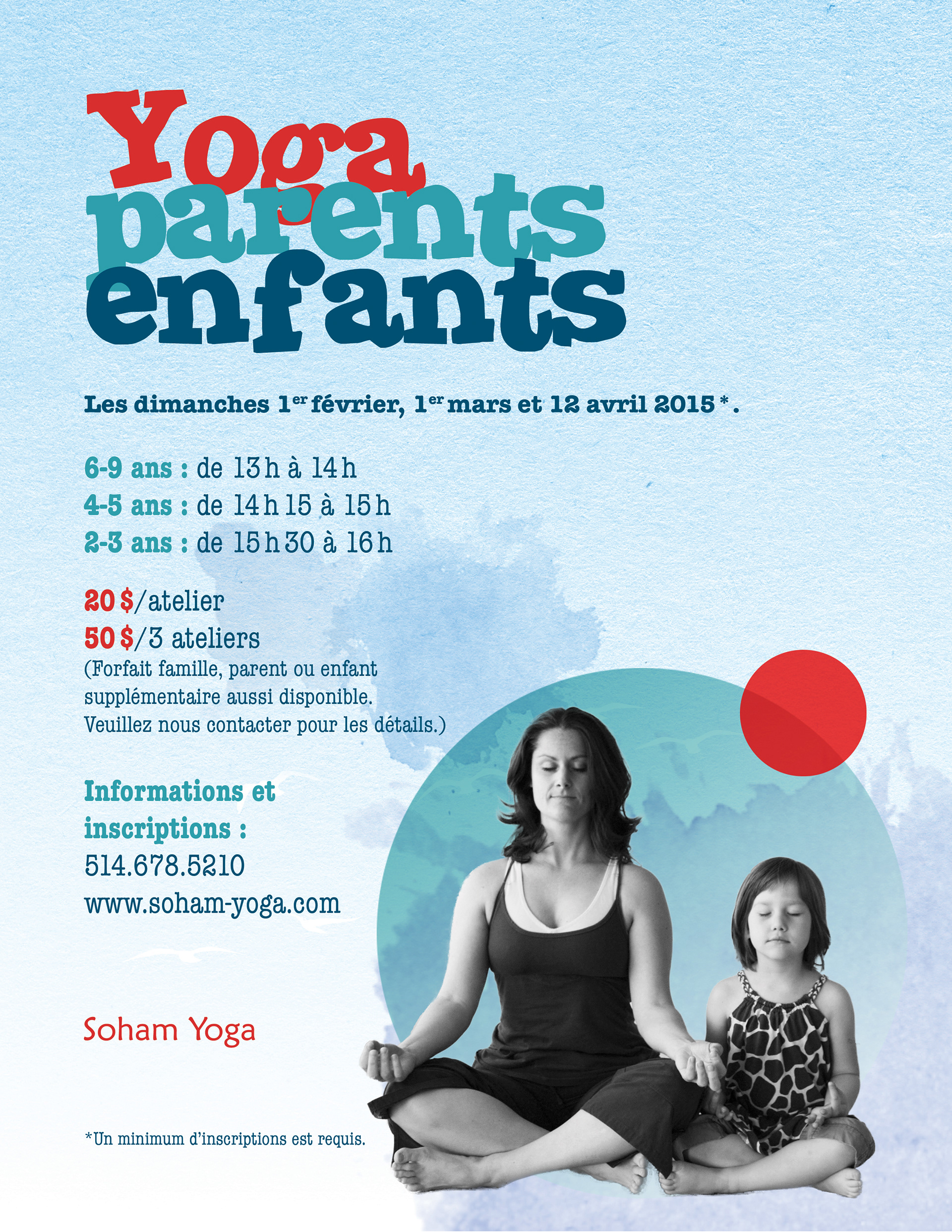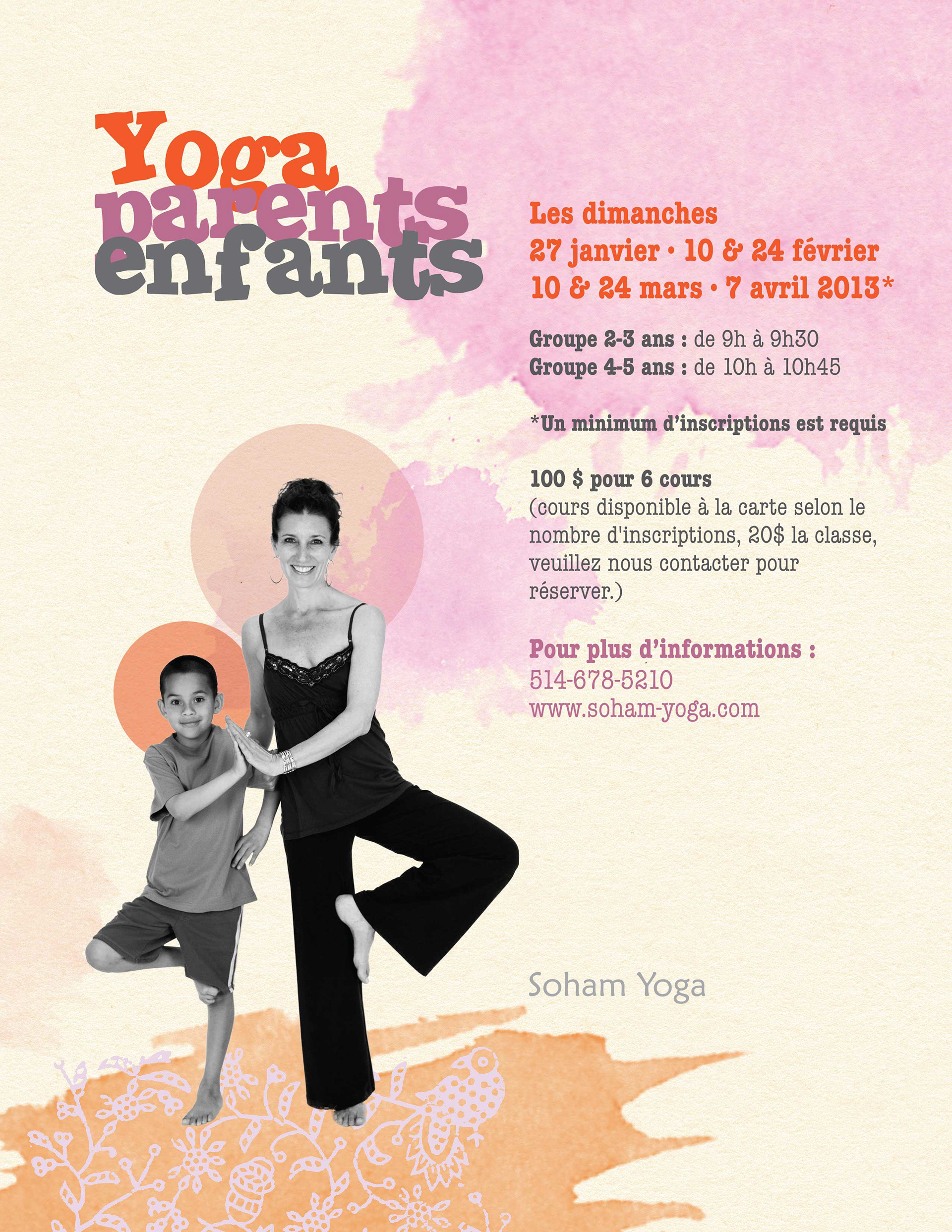 Différentes affiches promotionnelles pour le studio Soham Yoga annonçant les cours Parents Enfants. / Promotional posters for Soham Yoga for Parents & Kids classes.