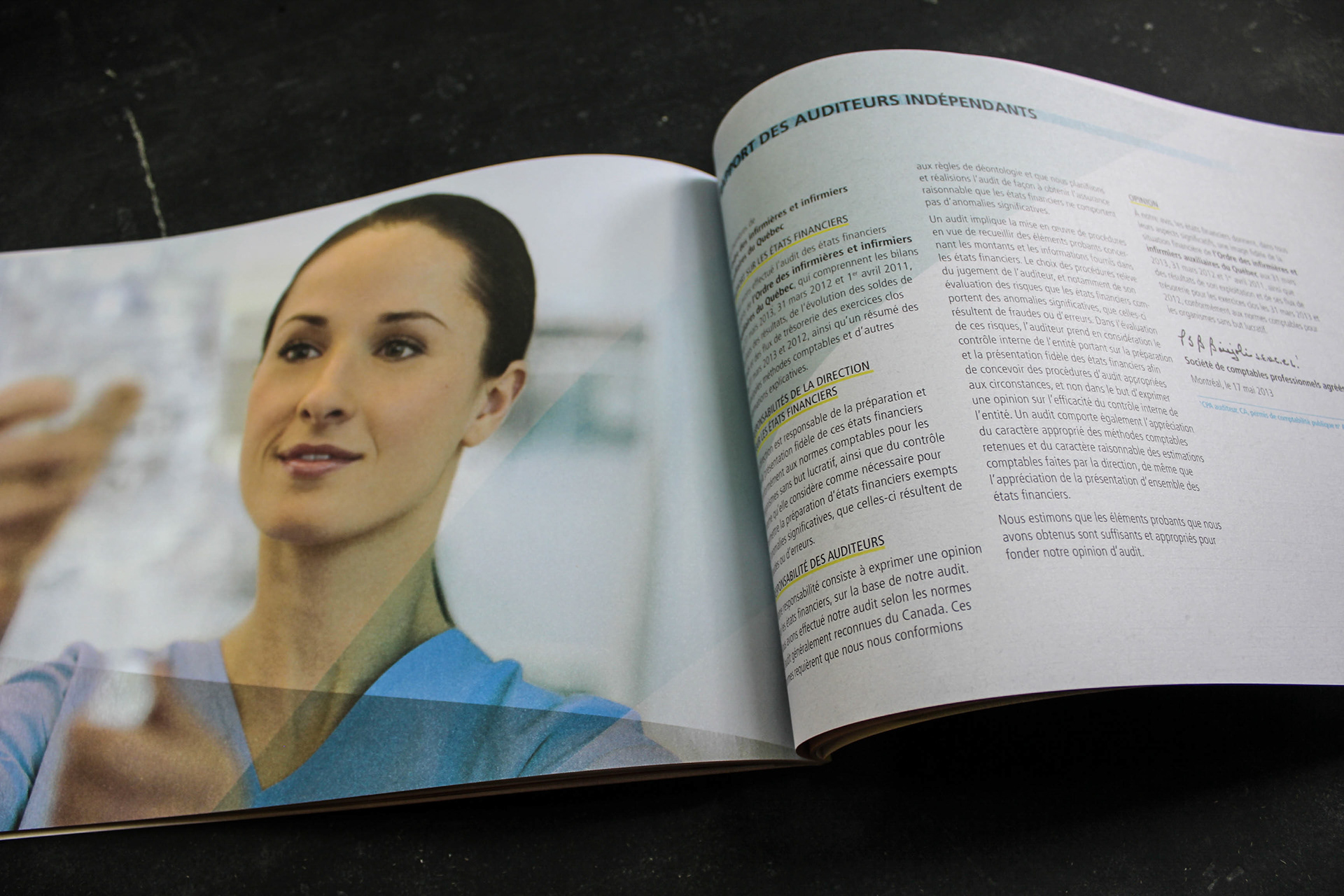 La ligne graphique du rapport annuel de l'OIIAQ 2012-2013 s'inspire de la mission de l'organisation, qui se trouve à la croisée entre la protection du public et la promotion du développement professionnel de ses membres. Ainsi, des bandes texturées aux couleurs vivantes se rencontrent en appuyant la trame graphique tout au long du document. Le format horizontal du rapport lui confère ergonomie et harmonie visuelle. La grille sur quatre colonnes permet d'aérer le texte et la police de caractère choisie, Frutiger, offre une lecture fluide. Les tons dominants de cyan et jaune éclatants jouent le rôle d'accents chromatiques en s'appliquant aux textes qui demandent une visibilité accrue.